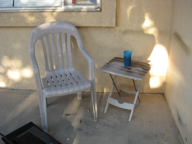 Tonight for a change in view, I decided to get my $10 Walmart patio “furniture” (just a chair and cheapo table) and bring it out front and sit like an old lady with my iced tea and my…. laptop. Yes, like an old lady… who’s up to date with technology. Anyway.